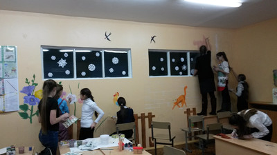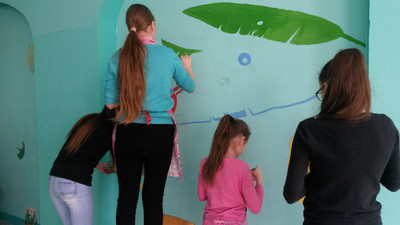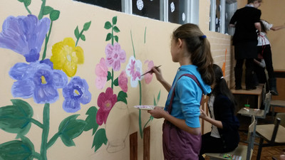 Наши учащиеся во время весенних каникул расписывали стены в коридорах родной школы. Девочки из студии "Творческая мастерская" Баряева Даша (6в), Александрова Карина (6а), Александрова Кристина(6а), Волкова Соня(6г), Дмитриева Женя(6а), Еремеева Соня(6в), Серебрякова Соня(6б), Дмитриева Яна(4в) украсили однотонные стены красивыми пейзажами, сказочными персонажами. Теперь, глядя на веселые картины, у детей на переменах будет подниматься настроение. Воспитанники студии творчески подошли к своему заданию. Молодцы!